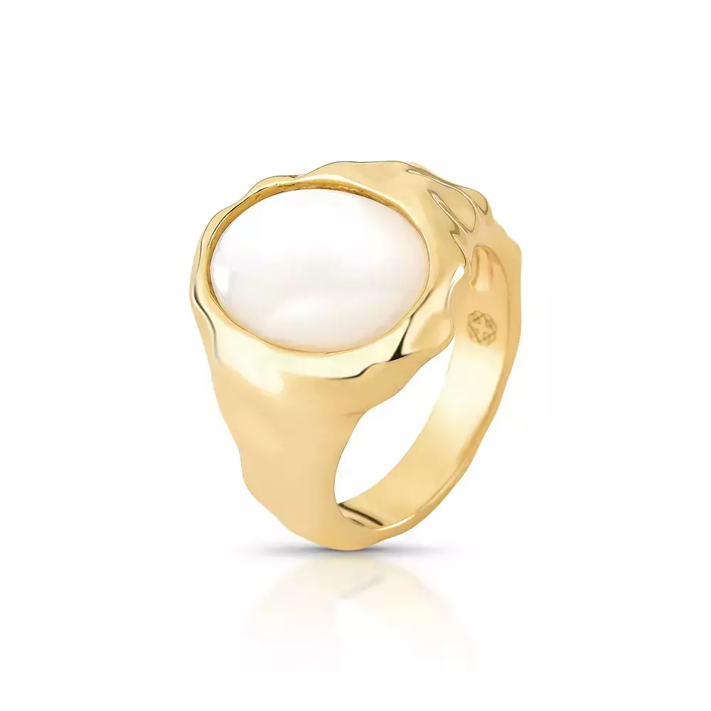 O Anel Glam Madre e textura orgânica é uma peça statement que une força e delicadeza. Com base robusta em metal texturizado e acabamento artesanal, ele carrega ao centro uma madrepérola luminosa, símbolo de feminilidade e elegância natural. O contraste entre o brilho perolado e a textura do metal cria um visual sofisticado, perfeito para clientes que buscam joias únicas com personalidade. Uma peça versátil, ideal para uso solo ou composições.