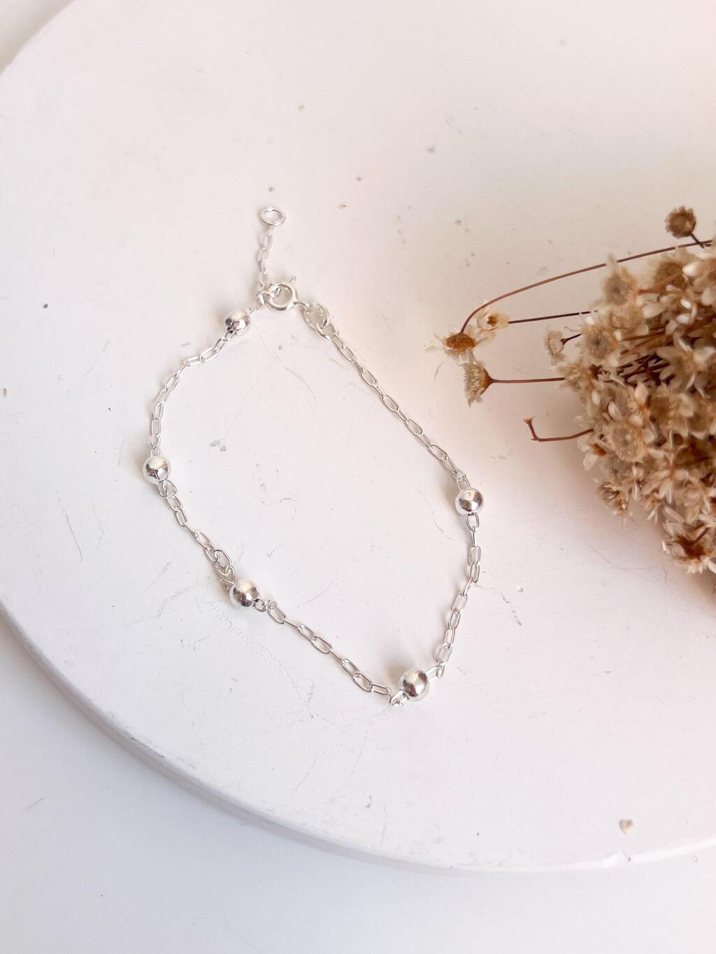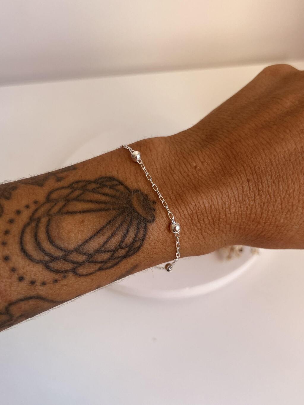 A pulseira de prata com bolinhas espaçadas é uma peça delicada e moderna, que combina bem com diferentes estilos de acessórios. Geralmente, ela apresenta uma corrente de prata com pequenos detalhes em formato de bolinhas distribuidas ao longo dela, criando um efeito espaçado e elegante. Perfeita para quem busca um acessório sutil, mas com presença, ideal para usar sozinha ou em um mix de pulseiras.