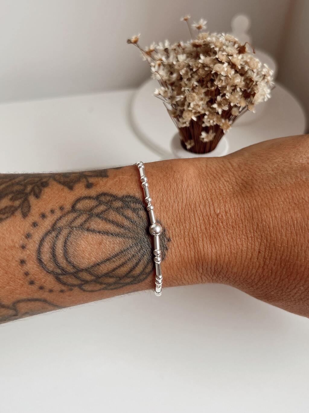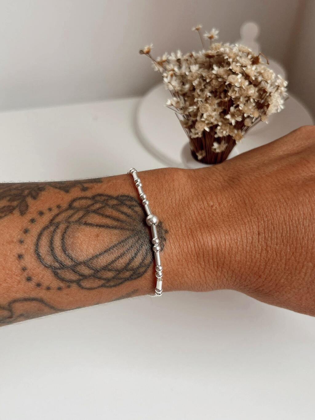 Essa pulseira é aquele acessório que combina com tudo e deixa seu visual mais descolado! Com canutilhos de prata e várias esferas de tamanhos diferentes, ela traz um visual bem descontraído, cheio de movimento e personalidade. Perfeita pra usar sozinha ou misturada com outras pulseiras, deixando seu estilo mais cheio de vibe e atitude.